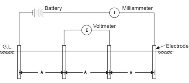 The Wenner arrangement consists of four equally spaced (A) electrodes driven approximately 20 cm into the ground as shown in the following figure.