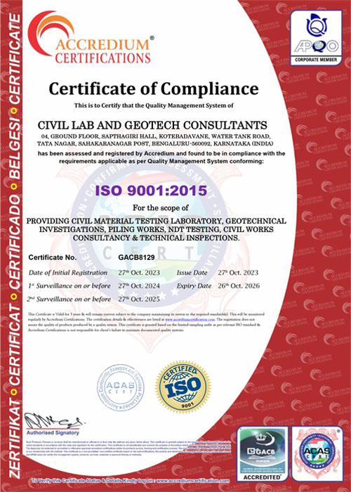 NABL 17025 accredited laboratory for all types of pile tests - Pile Load Testing, Plate Load Testing, Steel Testing Services, Pile Foundation, Non Destructive Ultrasonic Concrete Testing, Lateral Load Test For Pile Foundation, Cement Testing & Geotechnical Investigation.